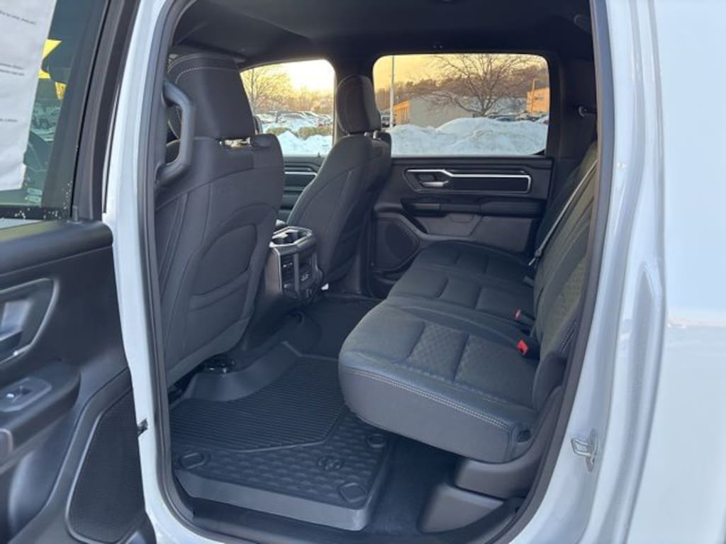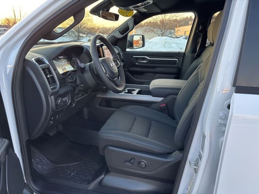Big Horn Level 2 Equipment Group (115V Auxiliary Power Outlet, 115V Auxiliary Rear Power Outlet, 12" Touchscreen Display, 2nd Row In Floor Storage Bins, 400W Inverter, 4G LTE Wi-Fi Hot Spot, 9 Amplified Speakers w/Subwoofer, Air Conditioning ATC w/Dual Zone Control, Apple CarPlay, Auto Power-Folding Mirrors, Auto-Dimming Exterior Driver Mirror, Auto-Dimming Rear-View Mirror, Black Exterior Mirrors, Black Premium Power Mirrors, Cluster 7.0" TFT Color Display, Configurable Drive Mode, Connected Travel & Traffic Services, Connectivity - US/Canada, Convex Wide-Angle Exterior Mirror Insert, Exterior Mirrors Courtesy Lamps, Exterior Mirrors w/Heating Element, Exterior Mirrors w/Supplemental Signals, Glove Box Lamp, Google Android Auto, GPS Antenna Input, GPS Navigation, HD Radio, Heated Front & Rear Seats, Heated Steering Wheel, Integrated Voice Command w/Bluetooth, Leather Wrapped Steering Wheel, LED Dome Lamp w/On/Off Switch, LED Footwell Lighting, Media Hub w/2 Charge Only USBs, Overhead LED Lamps, Power 2-Way Driver Lumbar Adjust, Power Adjust 8-Way Driver Seat, Power Adjustable Pedals, Premium Overhead Console, Radio: Uconnect 5 Nav w/12.0" Display, Rear Power Sliding Window, Rear Window Defroster, Remote Tailgate Release, Security Alarm, SiriusXM w/360L, Steering Wheel Mounted Audio Controls, Sun Visors w/Illuminated Vanity Mirrors, Universal Garage Door Opener, and USB Host Flip), Night Edition (3 Rear Seat Head Restraints, 4 Way Front Headrests, Accent Color Door Handles, Accent Color Premium Power Mirrors, Accent Color Tailgate Handle, Anti-Spin Differential Rear Axle, Black Exterior Truck Badging, Black Headlamp Bezels, Black Interior Accents, Black Painted Exterior Mirrors Caps, Black Tail Lamp Bezels, Body Color Front Bumper, Body Color Rear Bumper w/Step Pads, Bucket Seats, Deluxe Cloth Bucket Seats, Front Seat Back Map Pockets, Full Length Floor Console, Grille Black Surround Black Mesh, Manual Adjust 4-Way Front Passenger Seat, RAM Grille Badge - Black, Rear 60/40 Folding Seat, Rear Center Armrest, and Wheels: 20" x 9.0" Aluminum Painted Clad), Quick Order Package 23Z Big Horn (Big Horn Badge), 3.21 Rear Axle Ratio, 4-Wheel Disc Brakes, 6 Speakers, ABS brakes, Air Conditioning, Alloy wheels, AM/FM radio, Apple CarPlay/Android Auto, Auto High-beam Headlights, Brake assist, Bumpers: chrome, Cloth Bench Seat, Cluster 12" TFT Color Display, Compass, Delay-off headlights, Driver door bin, Dual front impact airbags, Dual front side impact airbags, Electronic Stability Control, Front anti-roll bar, Front Center Armrest w/Storage, Front fog lights, Front License Plate Bracket, Front reading lights, Front wheel independent suspension, Fully automatic headlights, Heated power door mirrors, Illuminated entry, Low tire pressure warning, Manual Folding Exterior Mirrors, Manufacturer's Statement of Origin, MOPAR Front & Rear Rubber Floor Mats, Occupant sensing airbag, Outside temperature display, Overhead airbag, Overhead console, Panic alarm, ParkView Rear Back-Up Camera, Passenger door bin, Passenger vanity mirror, Power door mirrors, Power steering, Power windows, Radio data system, Radio: Uconnect 5 W w/8.4" Display, RAM Grille Badge - Chrome, Rear anti-roll bar, Rear seat center armrest, Rear step bumper, Remote keyless entry, Speed control, Split folding rear seat, Supplier Part Tracking (J-1), Tachometer, Telescoping steering wheel, Tilt steering wheel, Traction control, Trip computer, Variably intermittent wipers, Voltmeter, and Wheels: 18" x 8" Cast-Aluminum Painted.