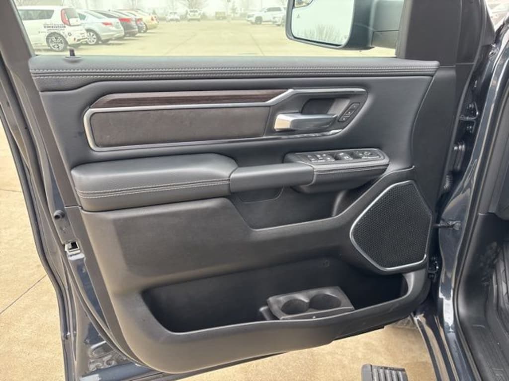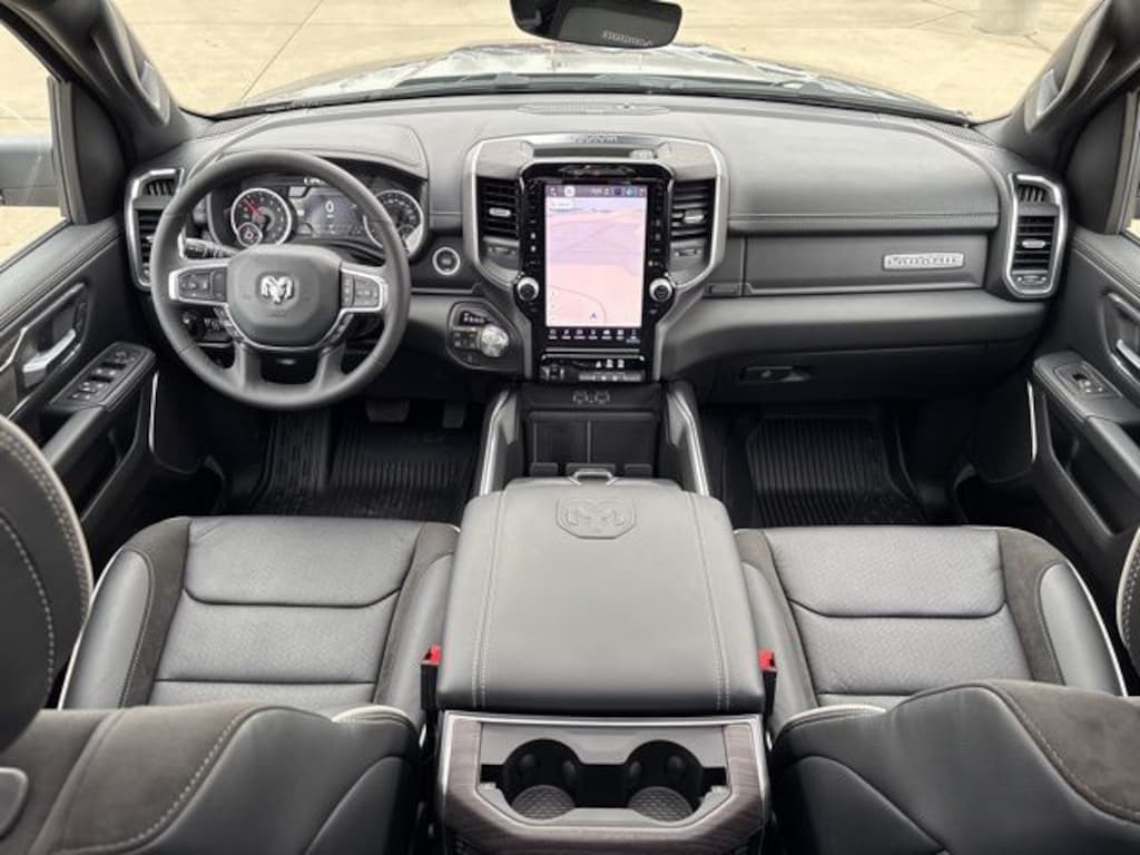 Bed Utility Group (Exterior 115V AC Outlet, MOPAR 4 Adjustable Cargo Tie-Down Hooks, and MOPAR Spray in Bedliner), Laramie Level 1 Equipment Group (Rain Sensitive Windshield Wipers and Remote Tailgate Release), Laramie Preferred Package (Accent Color Premium Power Mirrors, Auto Power-Folding Mirrors, Auto-Dimming Exterior Driver Mirror, Black Painted Exterior Mirrors Caps, Body Color Front Bumper, Body Color Rear Bumper with Step Pads, Convex Wide-Angle Exterior Mirror Insert, Dome Dual LED Reading Lamp, Dual-Pane Panoramic Sunroof, Exterior Mirrors Courtesy Lamps, Exterior Mirrors with Heating Element, Exterior Mirrors with Memory, Exterior Mirrors with Supplemental Signals, Grille Surround 3 Body Color Tex 4 Chrome, LED Dome/Reading Lamp, Power Deployable Running Boards, RAM Grille Badge - Chrome, Tow Hooks, and Trailer Brake Control), Quick Order Package 21H Laramie, 10 Speakers, 3.55 Rear Axle Ratio, 4-Wheel Disc Brakes, 4G LTE Wi-Fi Hot Spot, ABS brakes, Active Noise Control System, Adjustable pedals, Air Conditioning, Alloy wheels, AM/FM radio: SiriusXM with 360L, Anti-Spin Differential Rear Axle, Apple CarPlay/Android Auto, Audio memory, Auto High-beam Headlights, Auto-dimming door mirrors, Auto-dimming Rear-View mirror, Automatic temperature control, Brake assist, Bumpers: chrome, Chrome Exterior Mirrors, Compass, Connected Travel and Traffic Services, Connectivity - US/Canada, Delay-off headlights, Driver door bin, Driver vanity mirror, Dual front impact airbags, Dual front side impact airbags, Electronic Stability Control, Front anti-roll bar, Front Bucket Seats, Front Center Armrest w/Storage, Front dual zone A/C, Front fog lights, Front License Plate Bracket, Front reading lights, Front wheel independent suspension, Fully automatic headlights, Garage door transmitter, GPS Navigation, Heated front seats, Heated power door mirrors, Heated rear seats, Heated steering wheel, Illuminated entry, Integrated Center Stack Radio, Integrated Voice Command with Bluetooth, Leather steering wheel, Leather Trimmed Bucket Seats, Low tire pressure warning, Manufacturer's Statement of Origin, Memory seat, MOPAR Front and Rear Rubber Floor Mats, MyFlexCare Service Plan, Navigation System, Occupant sensing airbag, Off-Road Information Pages, Outside temperature display, Overhead airbag, Overhead console, Panic alarm, ParkView Rear Back-Up Camera, Passenger door bin, Passenger vanity mirror, Pedal memory, Pirelli Brand Tires, Power door mirrors, Power driver seat, Power passenger seat, Power steering, Power windows, Radio data system, Radio: Uconnect 5 Navigation with 12.0" Display, Rear anti-roll bar, Rear reading lights, Rear seat center armrest, Rear step bumper, Remote keyless entry, Security system, SiriusXM Radio Service, SiriusXM with 360L, Speed control, Split folding rear seat, Steering wheel mounted audio controls, Tachometer, Telescoping steering wheel, Tilt steering wheel, Traction control, Trip computer, Turn signal indicator mirrors, USB Host Flip, Variably intermittent wipers, Ventilated front seats, Voltmeter, Wheels: 20" x 9" Premium Paint/Polish, and Wheels: 22" x 9" Forged Aluminum.