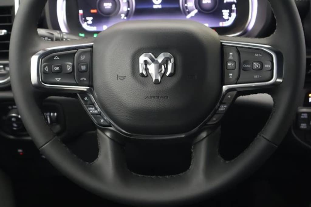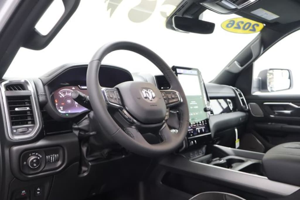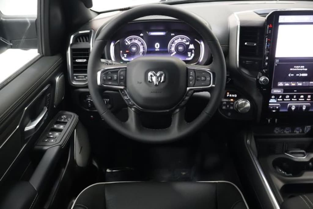 Laramie Level 2 Equipment Group (14.4" Touchscreen Display, 4G LTE Wi-Fi Hot Spot, Cluster 12" TFT Color Display, Connected Travel and Traffic Services, Connectivity - US/Canada, Front Passenger Interactive Display, GPS Navigation, Harman/Kardon 19 Speaker Premium Sound, Integrated Center Stack Radio, Integrated Voice Command with Bluetooth, Power Tailgate, Radio: Uconnect 5 Nav with 14.4" Display, Rain Sensitive Windshield Wipers, SiriusXM Radio Service, SiriusXM with 360L, and USB Host Flip), Night Edition (Accent Color Door Handles, Accent Color Premium Power Mirrors, Accent Color Tailgate Handle, Anti-Spin Differential Rear Axle, Auto Power-Folding Mirrors, Auto-Dimming Exterior Driver Mirror, Black Exterior Truck Badging, Black Headlamp Bezels, Black Interior Accents, Black Painted Exterior Mirrors Caps, Black Tail Lamp Bezels, Body Color Front Bumper, Body Color Rear Bumper with Step Pads, Convex Wide-Angle Exterior Mirror Insert, Dual Exhaust with Black Tips, Exterior Mirrors Approach Lamps, Exterior Mirrors Courtesy Lamps, Exterior Mirrors with Heating Element, Exterior Mirrors with Memory, Exterior Mirrors with Supplemental Signals, Grille Surround 3 Black Texture 2 Black, Pirelli Brand Tires, Proximity Approach/Departure Lamps, RAM Grille Badge - Black, Sport Performance Hood, and Wheels: 22" x 9" Forged Aluminum), Quick Order Package 27H Laramie, 10 Speakers, 4-Wheel Disc Brakes, ABS brakes, Active Noise Control System, Adjustable pedals, Air Conditioning, Alloy wheels, AM/FM radio: SiriusXM with 360L, Apple CarPlay/Android Auto, Audio memory, Auto High-beam Headlights, Auto-dimming door mirrors, Auto-dimming Rear-View mirror, Automatic temperature control, Brake assist, Bumpers: chrome, Chrome Exterior Mirrors, Compass, Delay-off headlights, Driver door bin, Driver vanity mirror, Dual front impact airbags, Dual front side impact airbags, Electronic Stability Control, Front anti-roll bar, Front Bucket Seats, Front Center Armrest w/Storage, Front dual zone A/C, Front fog lights, Front License Plate Bracket, Front reading lights, Front wheel independent suspension, Fully automatic headlights, Garage door transmitter, Heated front seats, Heated power door mirrors, Heated rear seats, Heated steering wheel, Illuminated entry, Leather steering wheel, Leather Trimmed Bucket Seats, Low tire pressure warning, Manufacturer's Statement of Origin, Memory seat, MOPAR Front and Rear Rubber Floor Mats, Navigation System, Occupant sensing airbag, Off-Road Information Pages, Outside temperature display, Overhead airbag, Overhead console, Panic alarm, ParkView Rear Back-Up Camera, Passenger door bin, Passenger vanity mirror, Pedal memory, Power door mirrors, Power driver seat, Power passenger seat, Power steering, Power windows, Radio data system, Radio: Uconnect 5 Navigation with 12.0" Display, RAM Grille Badge - Chrome, Rear anti-roll bar, Rear reading lights, Rear seat center armrest, Rear step bumper, Rear Wheelhouse Liners, Remote keyless entry, Security system, Speed control, Split folding rear seat, Steering wheel mounted audio controls, Tachometer, Telescoping steering wheel, Tilt steering wheel, Traction control, Trailer Brake Control, Trip computer, Turn signal indicator mirrors, Variably intermittent wipers, Ventilated front seats, Voltmeter, and Wheels: 20" x 9" Premium Paint/Polish.