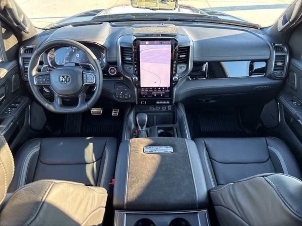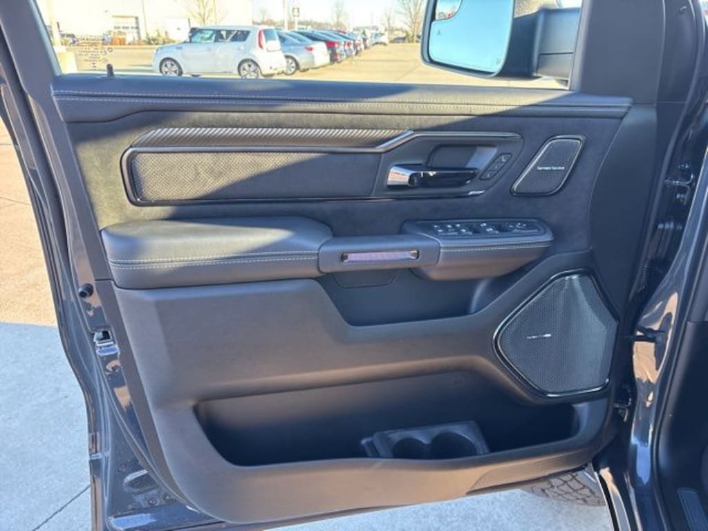 Bed Utility Group (Exterior 115V AC Outlet, MOPAR 4 Adjustable Cargo Tie-Down Hooks, and MOPAR Deployable Bed Step), Quick Order Package 22Y RHO, RHO Level 1 Equipment Group (12-Way/1-Way Trailer Connector, 14.4" Touchscreen Display, 240 Amp Alternator, 4G LTE Wi-Fi Hot Spot, Connected Travel and Traffic Services, Connectivity - US/Canada, Disassociated Touchscreen Display, Driver Power Seat Back Massage, Driver Seat Memory, Driver/Passenger Wrapped Assist Handles, Drowsy Driver Detection, Dual Wireless Charging Pad, Evasive Steer Assist, Exterior Mirrors with Memory, Front Passenger Interactive Display, Front Passenger Power Seat Back Massage, Full Length Premium Upgraded Floor Console, GPS Navigation, Hands-Free Active Driving Assist System, Harman/Kardon 19 Speaker Premium Sound, HD Radio, Heads-Up Display, Heated Second Row Seats, Integrated Center Stack Radio, Integrated Voice Command with Bluetooth, Intersection Collision Assist System, Leather/Carbon Flat-Bottom Steering Wheel, LED CHMSL Lamp, Luxury Front Door Trim Panel, Power Adjustable Pedals with Memory, Power Tailgate, Premium Wrapped Instrument Panel Bezel, Radio: Uconnect 5 Nav with 14.4" Display, Radio/Driver Seat/Mirrors/Pedals Memory, Rain Sensitive Windshield Wipers, Real Carbon Fiber Interior Accents, Rear 60/40 Folding Split Recline Seat, SiriusXM Radio Service, Smartphone as a Key Capable, Surround View Camera System, Traffic Sign Recognition, USB Host Flip, Ventilated Front Seats, and Ventilated Rear Seats), 10 Speakers, 3.92 Rear Axle Ratio, 4-Wheel Disc Brakes, ABS brakes, Adaptive suspension, Adjustable pedals, Air Conditioning, Alloy wheels, AM/FM radio, Apple CarPlay/Android Auto, Auto High-beam Headlights, Auto Power-Folding Mirrors, Auto-dimming door mirrors, Auto-Dimming Exterior Driver Mirror, Auto-dimming Rear-View mirror, Automatic temperature control, Brake assist, Compass, Delay-off headlights, Dome Dual LED Reading Lamp, Driver door bin, Driver vanity mirror, Dual front impact airbags, Dual front side impact airbags, Dual-Pane Panoramic Sunroof, Electronic Stability Control, Exterior Mirrors Courtesy Lamps, Exterior Mirrors with Heating Element, Exterior Mirrors with Supplemental Signals, Exterior Parking Camera Rear, Flareside Box, Front anti-roll bar, Front Bucket Seats, Front Center Armrest w/Storage, Front dual zone A/C, Front fog lights, Front License Plate Bracket, Front reading lights, Front wheel independent suspension, Fully automatic headlights, Garage door transmitter, Heated front seats, Heated power door mirrors, Heated steering wheel, Illuminated entry, Leather Shift Knob, Leather steering wheel, Leather Trimmed Bucket Seats, Low tire pressure warning, Manufacturer's Statement of Origin, MyFlexCare Service Plan, Navigation System, Occupant sensing airbag, Outside temperature display, Overhead airbag, Overhead console, Panic alarm, Passenger door bin, Passenger vanity mirror, Power door mirrors, Power driver seat, Power passenger seat, Power steering, Power windows, Radio data system, Radio: Uconnect 5 Navigation with 12.0" Display, Rear reading lights, Rear seat center armrest, Rear step bumper, Rear window defroster, Remote keyless entry, Security system, Speed control, Split folding rear seat, Sport steering wheel, Steering wheel mounted audio controls, Tachometer, Telescoping steering wheel, Tilt steering wheel, Traction control, Trip computer, Turn signal indicator mirrors, Variably intermittent wipers, Voltmeter, and Wheels: 18" x 9" Black Paint/Polish Aluminum.