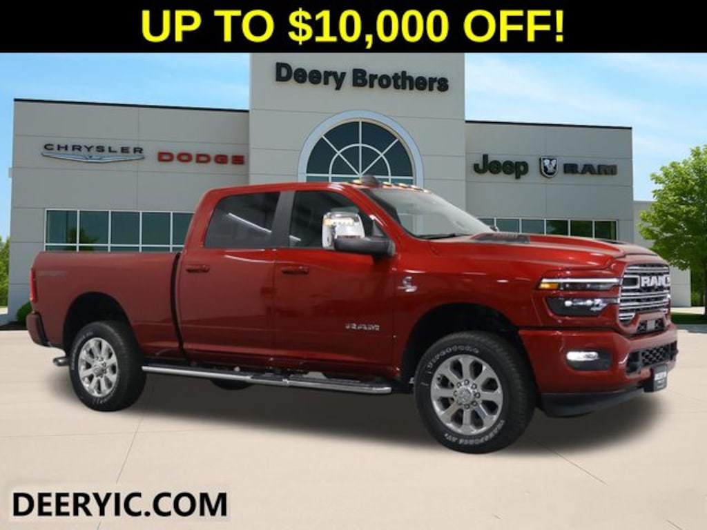 Cold Weather Group (Engine Block Heater and MOPAR Winter Front Grille Cover), Laramie Level 1 Plus Equipment Group (#1 Seat Foam Cushion, 115V Auxiliary Rear Power Outlet, 2 Way Rear Headrest Seat, 2nd Row in Floor Storage Bins, 4 Way Front Headrests, Active Lane Management System, Adaptive Steering System, Anti-Spin Differential Rear Axle, Auto Adjust in Reverse Exterior Mirrors, Auto Dim Exterior Mirror, Auto High Beam Headlamp Control, Auto Power-Folding Mirrors, Auto-Dimming Exterior Passenger Mirror, Bucket Seats, Center Stop Lamp with Cargo View Camera, Chrome Exterior Mirrors, Drowsy Driver Detection, Dual Wireless Charging Pad, Exterior Mirrors Courtesy Lamps, Exterior Mirrors with Heating Element, Exterior Mirrors with Memory, Exterior Mirrors with Supplemental Signals, Foam Bottle Insert (door Trim Panel), Folding Flat Load Floor Storage, Forward and Reverse Utility Lights, Front Seat Back Map Pockets, Full Length Upgraded Floor Console, Heated Front & Rear Seats, Heated Steering Wheel, High Back Seats, Leather Trimmed Bucket Seats, LED Bed Lighting, Mirror Running Lights, MOPAR Deployable Bed Step, MOPAR Spray in Bedliner, Power 2-Way Driver Lumbar Adjust, Power 2-Way Passenger Lumbar Adjust, Power Adjust 8-Way Driver Seat, Power Adjust 8-Way Front Passenger Seat, Power Adjust Mirrors, Power Adjustable Pedals with Memory, Power Heated Fold Telescopic Mirrors with Memory, Power Telescoping Mirrors, Power-Adjustable Convex Aux Mirrors, Radio/Driver Seat/Mirrors/Pedals Memory, Rain Sensitive Windshield Wipers, Rear 60/40 Folding Seat, Remote Tailgate Release, Traffic Sign Recognition, and Ventilated Front Seats), Quick Order Package 24H Laramie, Sport Appearance Package (20" x 8.0" Polished Aluminum Wheels, Body Color Grille-Surround, Center Hub, Sport Decal, and Sport Performance Hood), 10 Speakers, 4-Wheel Disc Brakes, 4G LTE Wi-Fi Hot Spot, 5th Wheel/Gooseneck Towing Prep Group, ABS brakes, Air Conditioning, Alexa Built-in, Alloy wheels, AM/FM radio: SiriusXM with 360L, Apple CarPlay, Apple CarPlay/Android Auto, Auto-dimming Rear-View mirror, Automatic temperature control, Black Wheel Center Hub, Brake assist, Bumpers: body-color, Chrome Flat Wheel-to-Wheel Side Steps, Clearance Lamps, Compass, Connected Travel and Traffic Services, Connectivity - US/Canada, Dash Pass Thru Wire Circuits, Delay-off headlights, Disassociated Touchscreen Display, Driver door bin, Driver vanity mirror, Dual front impact airbags, Dual front side impact airbags, Electronic Stability Control, Emergency Vehicle Alert System (EVAS), For Details, Visit DriveUconnect.com, For More Info, Call 800-643-2112, Front anti-roll bar, Front Center Armrest w/Storage, Front dual zone A/C, Front fog lights, Front License Plate Bracket, Front reading lights, Fully automatic headlights, Garage door transmitter, Global Telematics Box Module, Google Android Auto, GPS Antenna Input, GPS Navigation, HD Radio, Heated front seats, Heated power door mirrors, Heated steering wheel, Illuminated entry, Instrument Panel Mounted Auxiliary Switches, Integrated Voice Command with Bluetooth, Leather Trim 40/20/40 Bench Seat, Low tire pressure warning, Manufacturer's Statement of Origin, MyFlexCare Service Diesel, Navigation System, Occupant sensing airbag, Off-Road Info Pages, Outside temperature display, Overhead airbag, Overhead console, Panic alarm, ParkView Rear Back-Up Camera, Passenger door bin, Passenger vanity mirror, Power door mirrors, Power driver seat, Power passenger seat, Power steering, Power windows, Radio data system, Radio: Uconnect 5 Navigation with 12.0" Display, Rear anti-roll bar, Rear reading lights, Rear seat center armrest, Rear step bumper, Rear window defroster, Remote keyless entry, Security system, Selectable Price does not include Taxes, Tags, License, & Fees. Not all customers qualify for all rebates.$1000 - 2026 National Bonus Cash . Exp. 04/30/2026 $1,000 Deery Trade In Bonus Cash. Must have a qualified trade in. See Dealer for details.