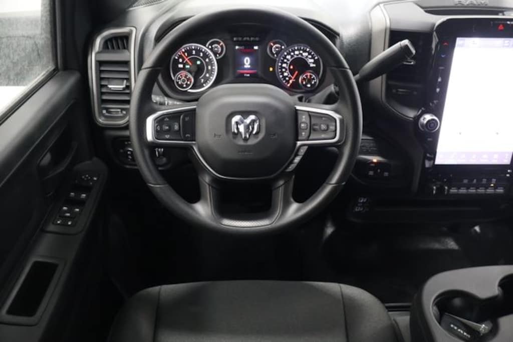 Bed Convenience Group (LED Bed Lighting and MOPAR Spray in Bedliner), Quick Order Package 2UA Tradesman, Tradesman Level 1 Equipment Group (115-Volt Auxiliary Front Power Outlet, 12" Touchscreen Display, 2 Way Rear Headrest Seat, 4 Way Front Headrests, 40/20/40 Split Bench Seat, 400W Inverter, 4G LTE Wi-Fi Hot Spot, Air Conditioning ATC with Dual Zone Control, Alexa Built-in, Apple CarPlay, Auto-Dimming Rear-View Mirror, Black Exterior Mirrors, Carpet Floor Covering, Cloth 40/20/40 Bench Seat, Connected Travel and Traffic Services, Connectivity - US/Canada, Convenience Group, Disassociated Touchscreen Display, Emergency Vehicle Alert System (EVAS), Exterior 115V AC Outlet, Exterior Mirrors Courtesy Lamps, Exterior Mirrors with Heating Element, Exterior Mirrors with Supplemental Signals, For Details Visit DriveUconnect.com, For More Info, Call 800-643-2112, Front and Rear Floor Mats, Front Armrest with Cupholders, Global Telematics Box Module, Google Android Auto, GPS Antenna Input, GPS Navigation, HD Radio, Integrated Voice Command with Bluetooth, Manual Adjust 4-Way Driver Seat, Manual Adjust 4-Way Front Passenger Seat, Manual Folding Exterior Mirrors, Manual Telescoping Mirrors, Mirror Running Lights, Mopar Black Tubular Side Steps, Off-Road Information Pages, ParkSense Front/Rear Park Assist System, Power Adjust Mirrors, Power Heat Fold Telescopic Mirrors, Power-Adjustable Convex Aux Mirrors, Radio: Uconnect 5 Navigation with 12.0" Display, Rear Folding Seat, Rear Power Sliding Window, Remote USB Port - Charge Only, Selectable Tire Fill Alert, SiriusXM Radio Service, SiriusXM with 360L, Storage Tray, Tinted Acoustic Windshield Glass, and Trailer Tow Pages), 3.73 Axle Ratio, 4-Wheel Disc Brakes, 6 Speakers, ABS brakes, Air Conditioning, AM/FM radio: SiriusXM, Apple CarPlay/Android Auto, Black Wheel Center Hub, Brake assist, Clearance Lamps, Compass, Dash Pass Thru Wire Circuits, Delay-off headlights, Driver door bin, Dual front impact airbags, Dual front side impact airbags, Electronic Stability Control, Front anti-roll bar, Front Center Armrest w/Storage, Front fog lights, Front License Plate Bracket, Front reading lights, Fully automatic headlights, Illuminated entry, Instrument Panel Mounted Auxiliary Switches, Low tire pressure warning, Manufacturer's Statement of Origin, MyFlexCare Service Plan, Occupant sensing airbag, Outside temperature display, Overhead airbag, Overhead console, Panic alarm, ParkView Rear Back-Up Camera, Passenger door bin, Passenger vanity mirror, Power steering, Power windows, Radio data system, Radio: Uconnect 5 with 8.4" Display, Rear step bumper, Rear window defroster, Remote keyless entry, Speed control, Tachometer, Tilt steering wheel, Traction control, Variably intermittent wipers, Voltmeter, and Wheels: 18" x 8.0" Black Painted SteeL.